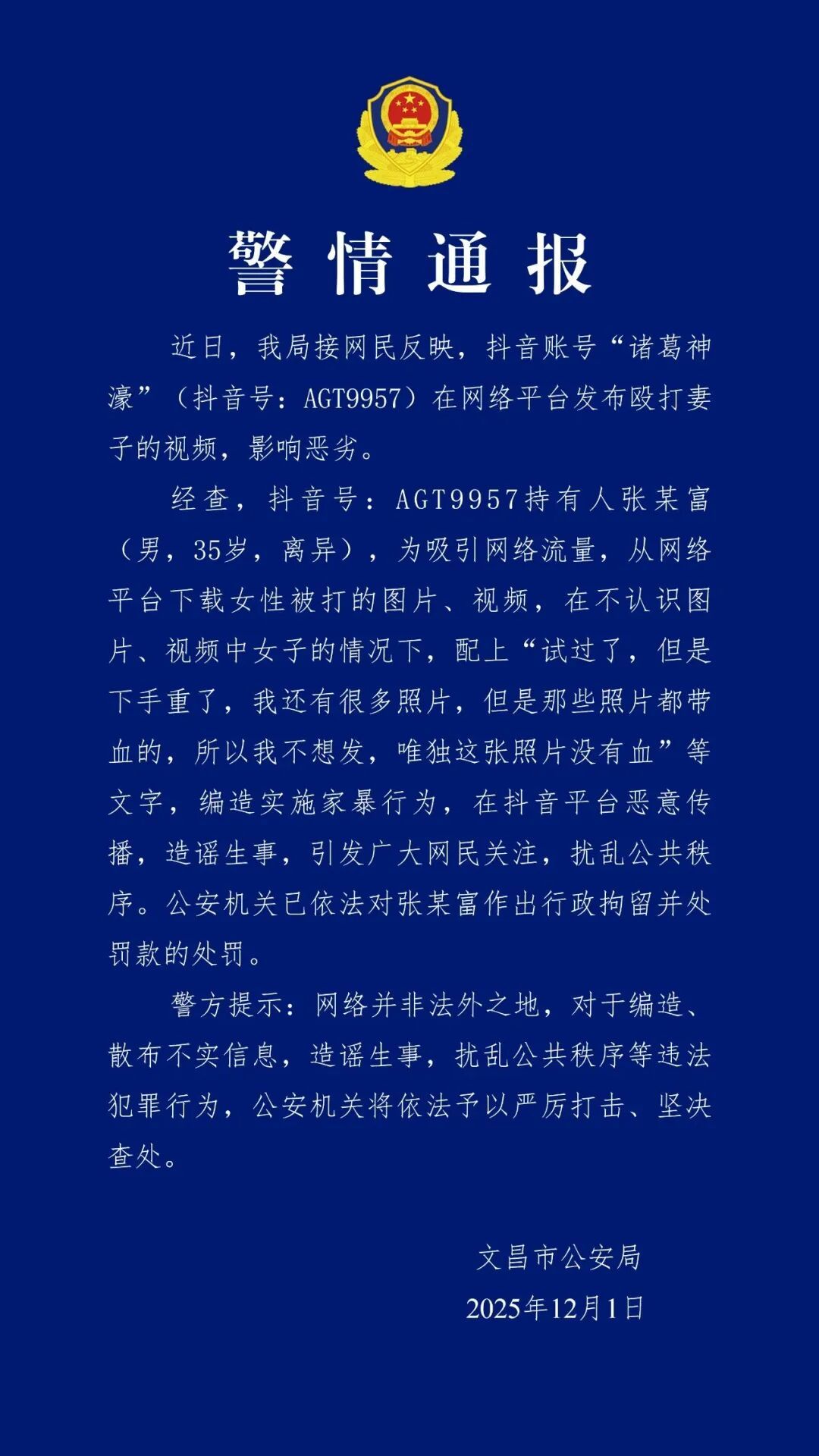 近日,文昌市公安局接网民反映,抖音账号“诸葛神濠”(抖音号:AGT9957)在网络平台发布殴打妻子的视频,影响恶劣。