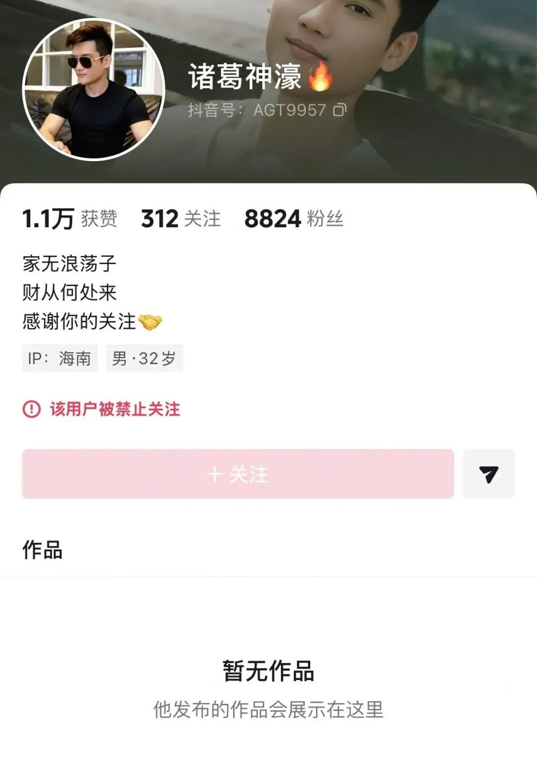 长安街知事搜索发现,目前,该账号在抖音平台已无法检索,相关截图显示账号已被禁止关注。